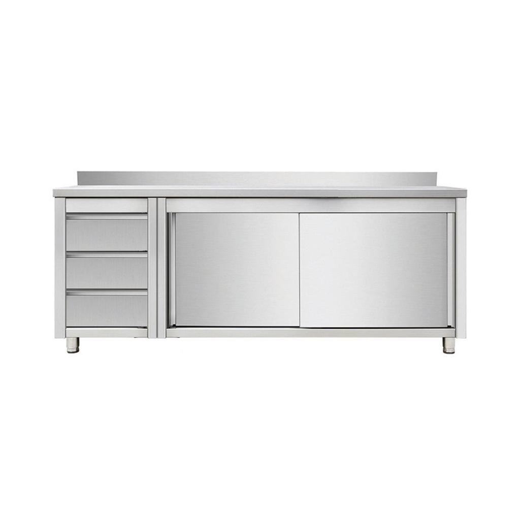 Arbeitsschrank mit Schiebetüren und Schubladenblock links, mit Aufkantung, 1600 x 700