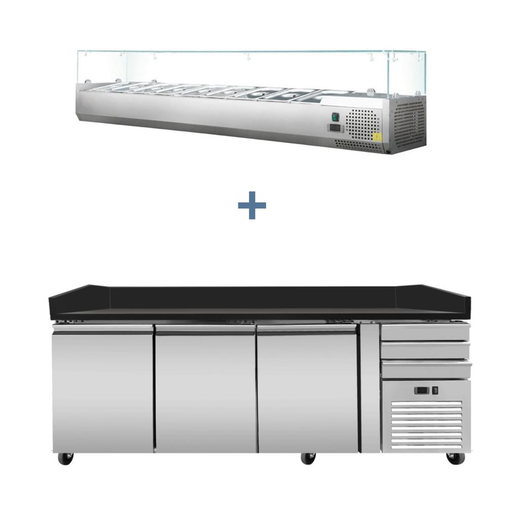 Pizza Kühltisch PRO, Granit Star Galsxy schwarz, 3 Türen + 3 Schubladen, 200 x 80 Kühlaufsatz GN1/3 mit Glas