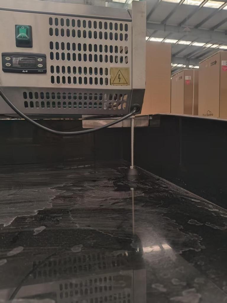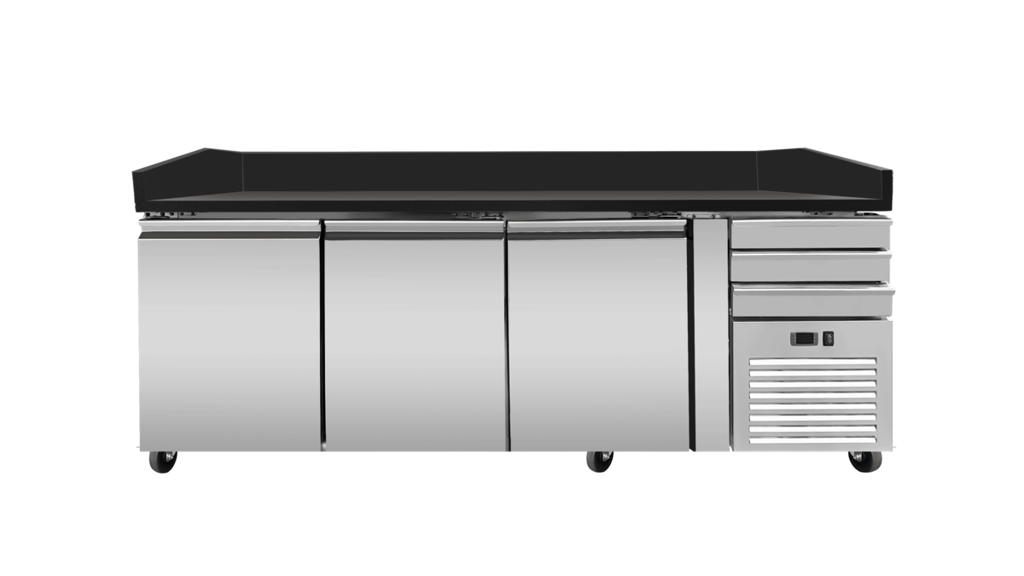 Skyrainbow Pizza Kühltisch PRO, Granit Star Galsxy schwarz, 3 Türen + 3 Schubladen, 200 x 80 Kühlaufsatz GN1/3 mit Glas