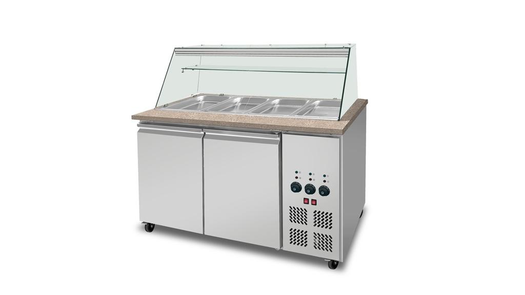 Skyrainbow SNACK-Line Bain-Marie Theke 3x GN1/1, Granit rosa-grau, 123x82x85,5 Glasaufbau Klarglas mit Zwischenablage, H=496mm
